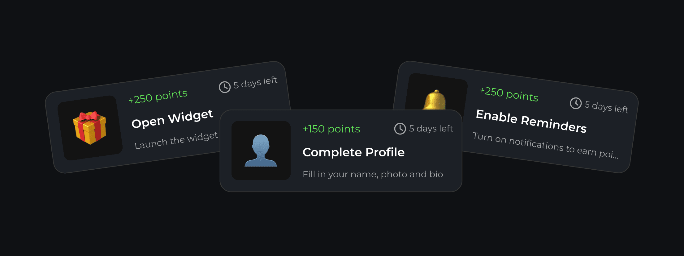 Onboarding completion rates drop when there's no immediate payoff. At this stage, you attach rewards to every meaningful step of the setup flow, so users get their first real moment of value faster, and with a points balance that makes the program feel worth continuing.